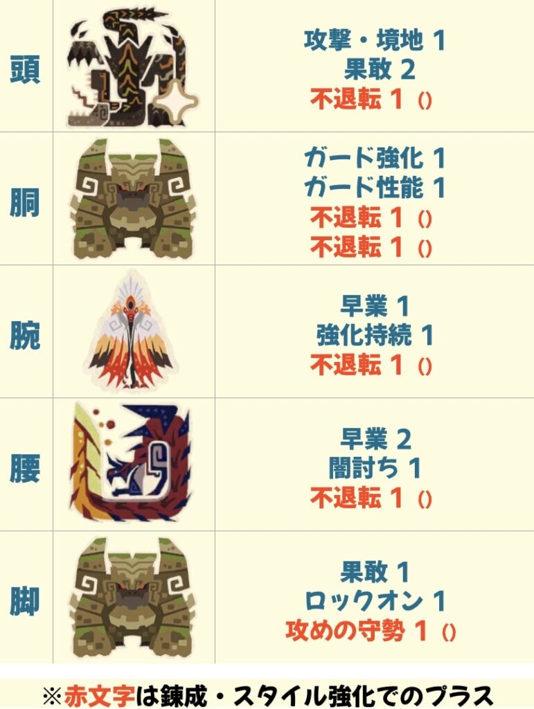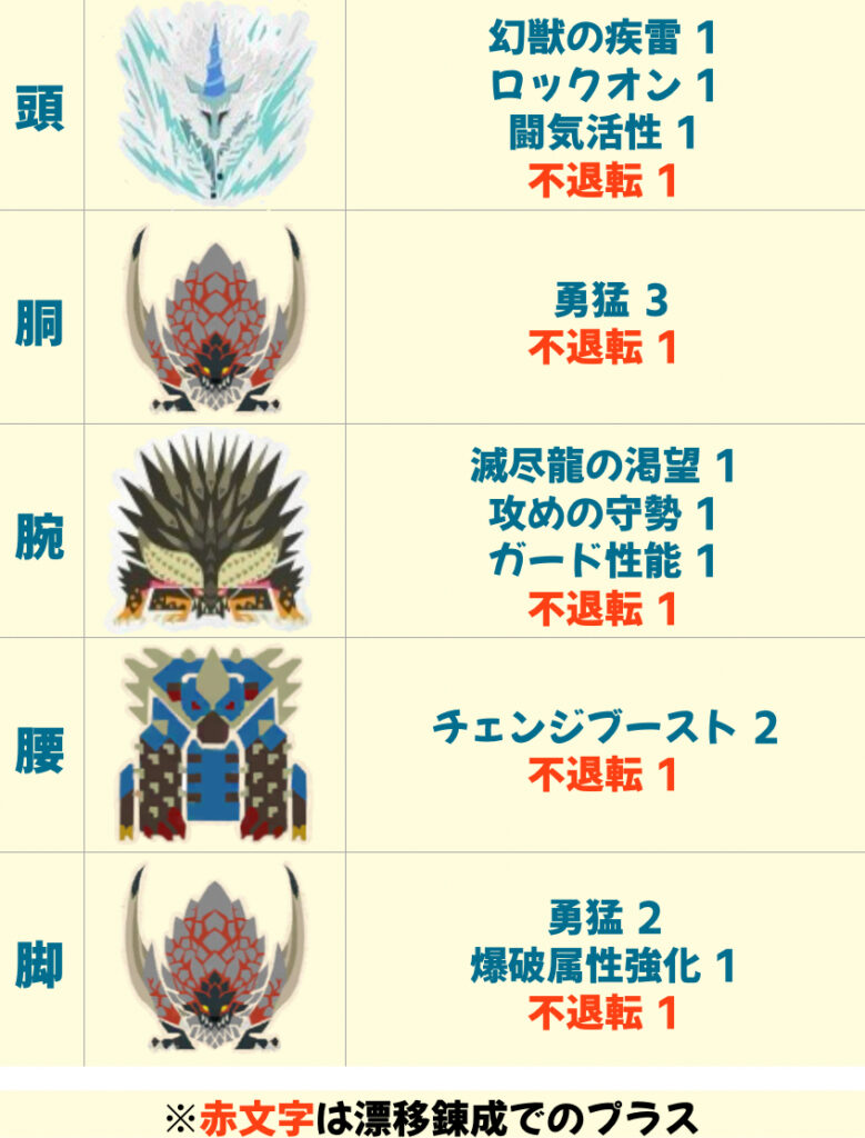 ここには主に、勇猛ありの属性汎用装備(火・水・氷・雷・龍 共通)を載せておきますが…。