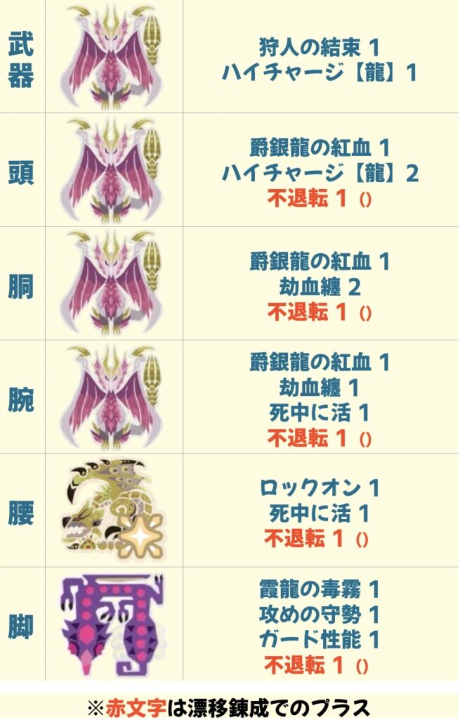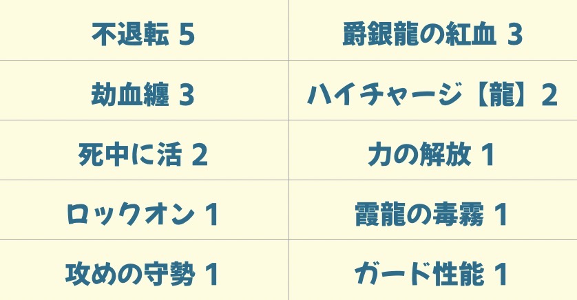 メル・ゼナの武器やら防具やらをふんだんに詰め込み、贅沢にスキルを盛った龍属性専用の構成です。
