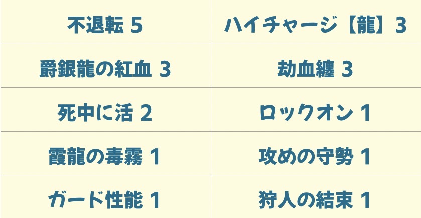 ハイチャージ【龍】の代わりに果敢をぶち込み、「ガード性能Lv2」も付け、普段狩りでも使いやすいようにしてみました。