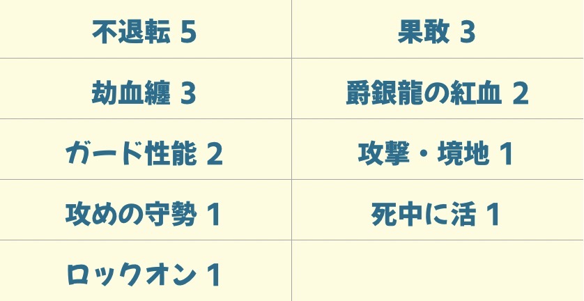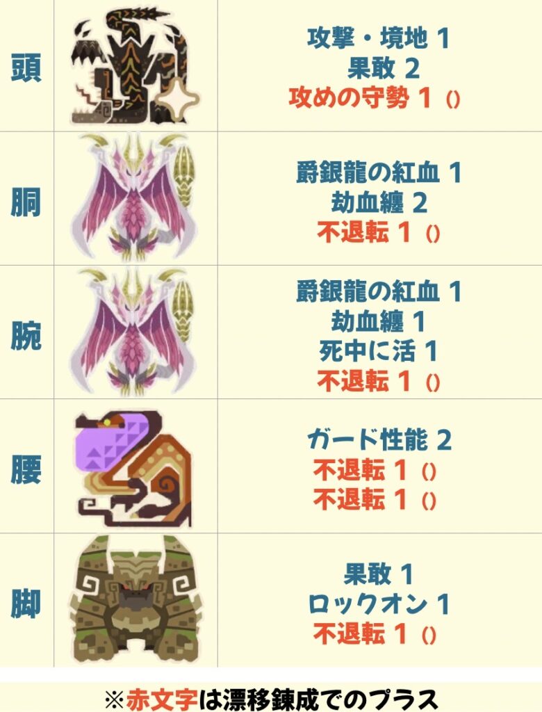 また、脚をミツネ(死中に活Lv2)にして錬成で「不退転Lv4」「ガード性能Lv1」を付けた方が純粋な火力は上かもですが、状態異常中しか発動しない「死中に活」よりも、「不退転」を優先する方が好きなのでこの形になりました。