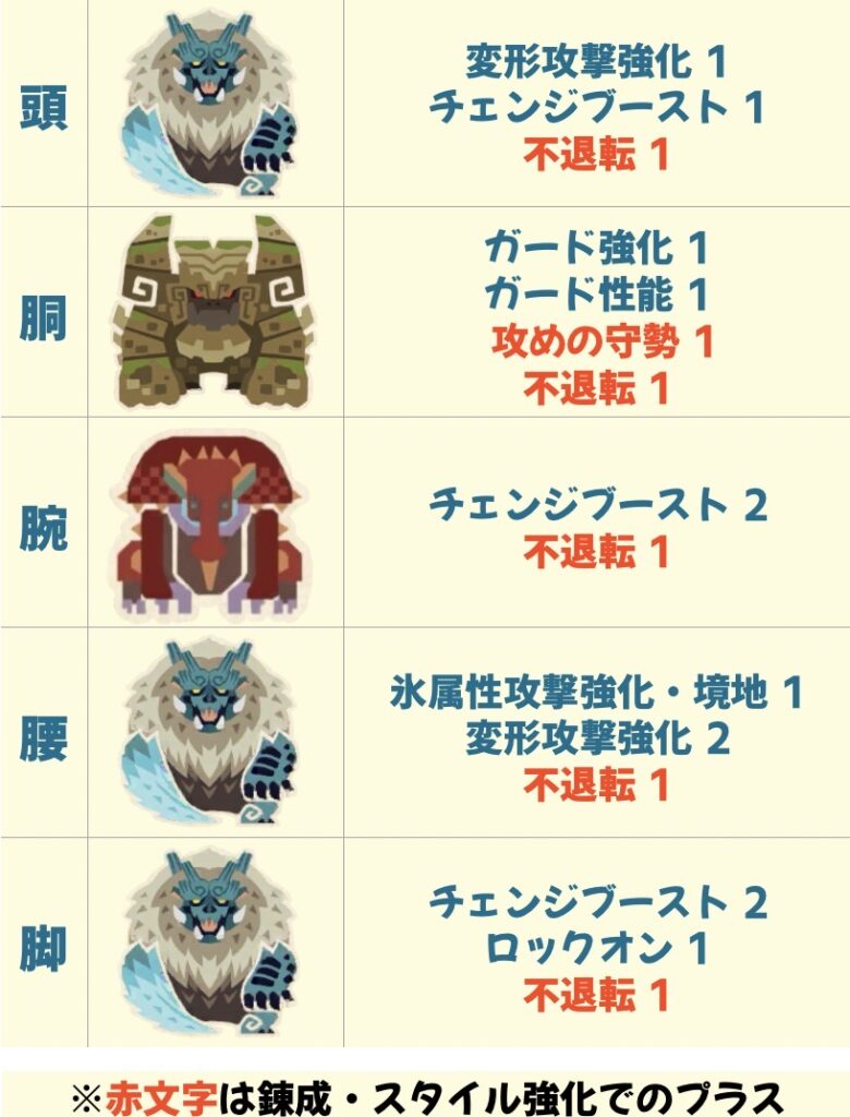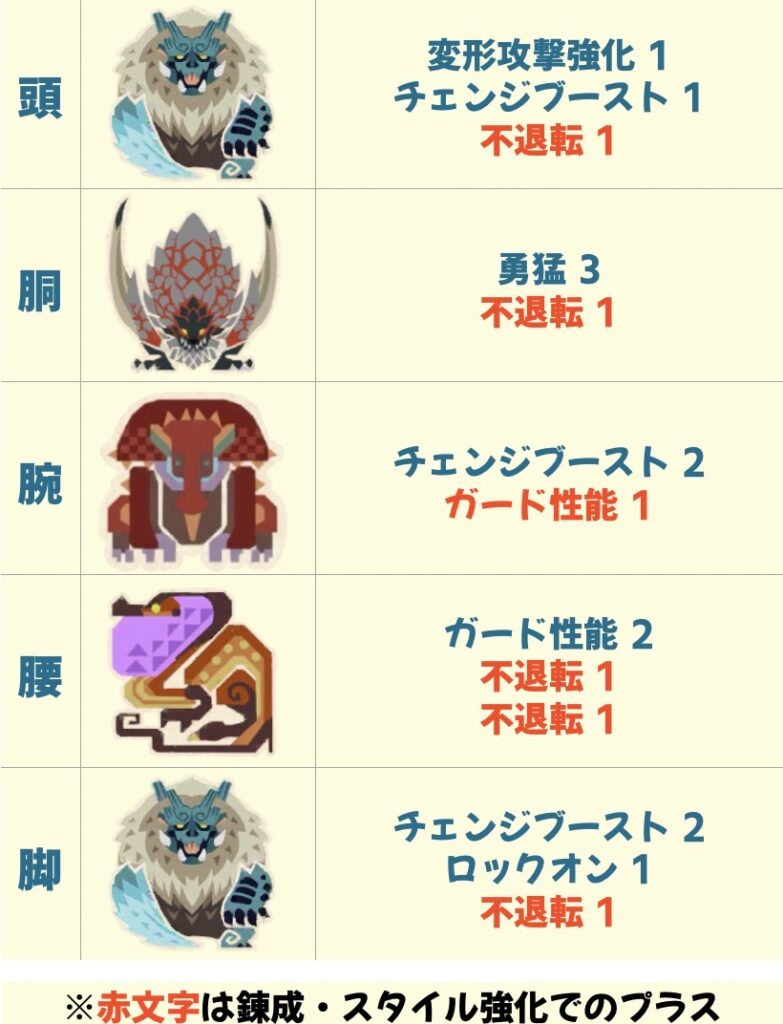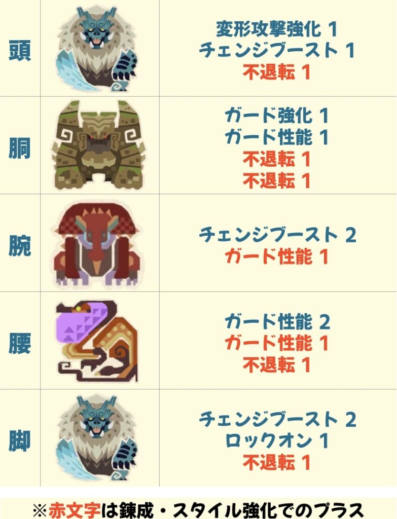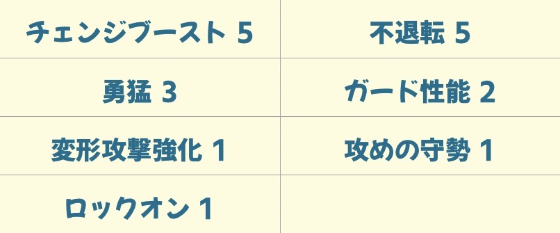 慣れない相手の練習から、回復薬を節約したい普段狩りまで、多くの場面で使える「ガード性能5+ガード強化」の構成に、「変形攻撃強化Lv1」をぶち込みました。