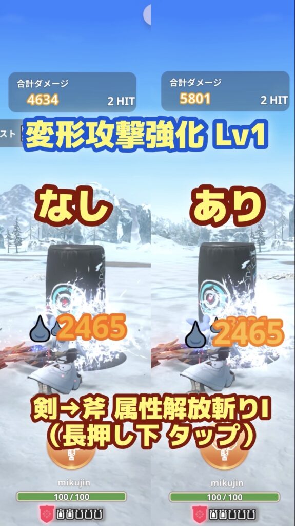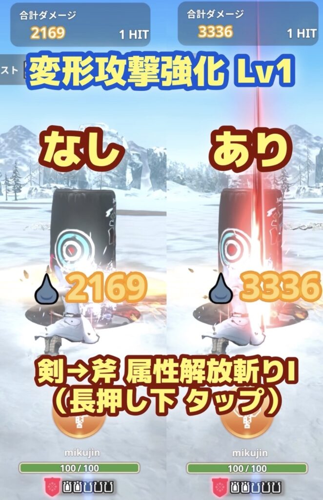 ※動画は「変形攻撃強化Lv1」以外は同じステータス、同じスキルで試しています。