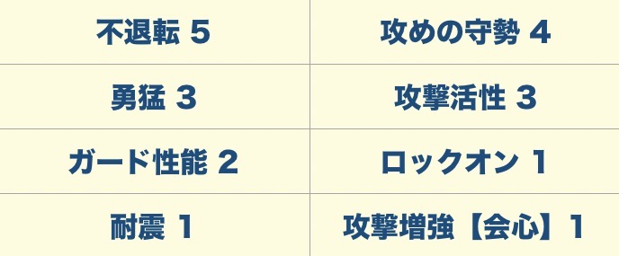 ちなみに、「攻めの守勢Lv5」ではなく「不退転Lv5」にしたのは、そっちの方がダメージが上がるからです。